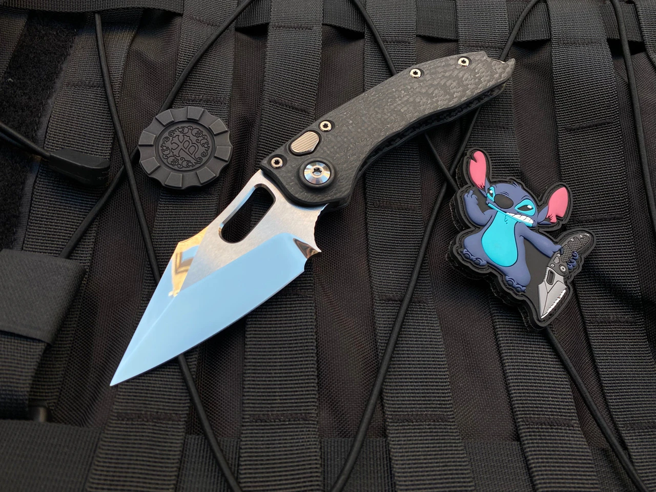 This beautiful example of the auto Stitch is born from the collaborative efforts of Tony Marfione and Sebastian Berenji. This piece features a full carbon fiber body with two tone Hardware. The blade features their newest finish: the Diamond wash. This finish gives the blade a beautiful mirror effect with the usability of a stonewash. Stunning.