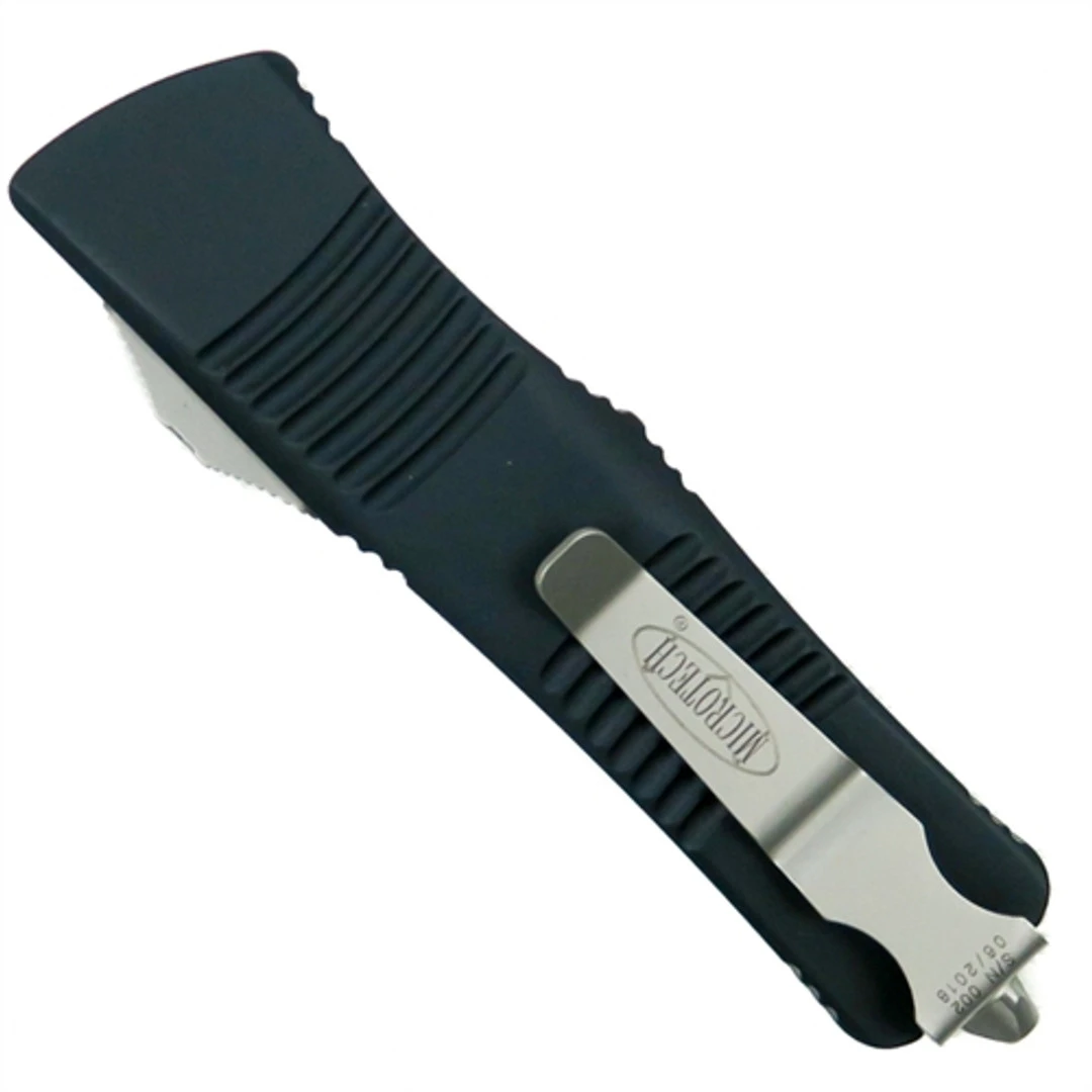 This Microtech Troodon OTF knife features a black anodized handle complete with standard bead blasted hardware and an integrated glass breaker function along with a dagger style blade in a satin finish.