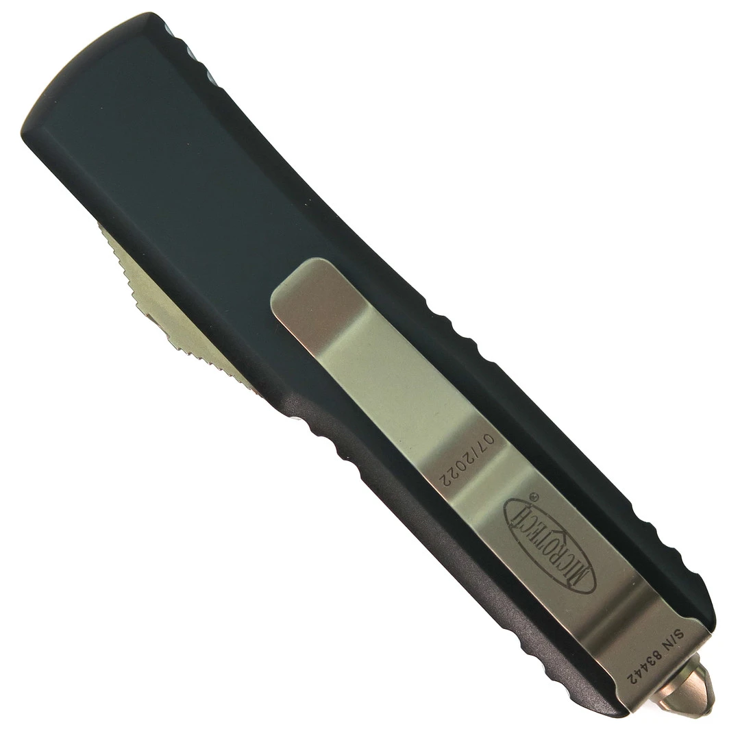 The radically redesigned Microtech UTX-85 out the front knife now features a new contoured handle, updated tri-angle hardware, a redesigned thumb slide and the glass breaker that now includes a press fitted ball bearing for a more comfortable, but still functional, user experience. This fantastic dual action knife is the ideal size and as the name exhibits, the UTX-85 is 85% the size of the flagship Ultratech knife but with 100% of the capability. The handle is made of aluminum, and the blade is a double edged dagger for extra piercing and slicing abilities. Equipped with a pocket clip, this knife is perfect for everyday carry.