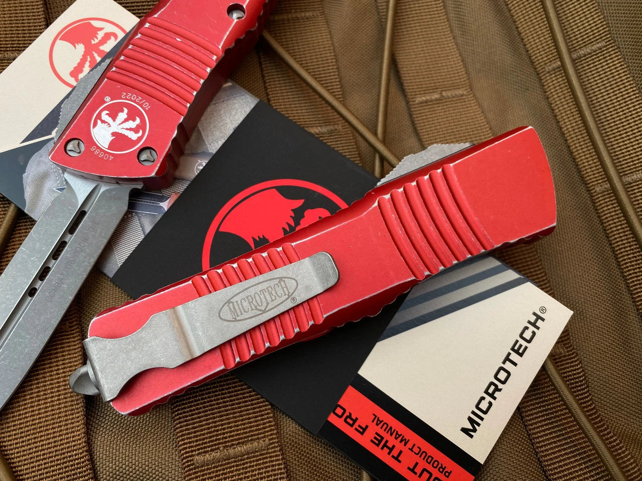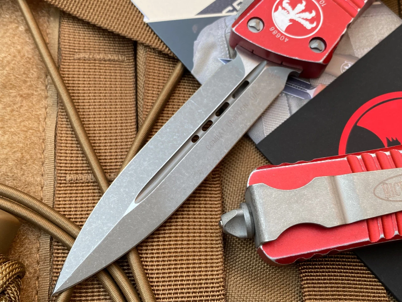 Microtech Combat Troodon D/E Distressed Red Aluminum Body W/ Stonewashed Plain Edge Blade (3.81”) 142-10DRD