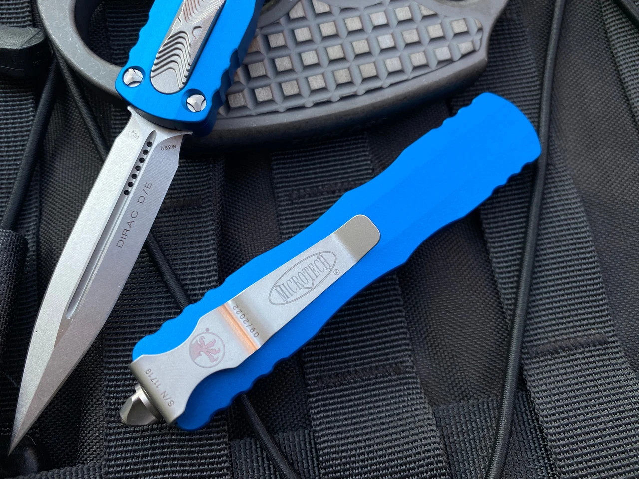 Microtech Dirac D/E Blue Aluminum Body W/ Stonewashed Plain Edge Blade (2.92”) 225-10BL