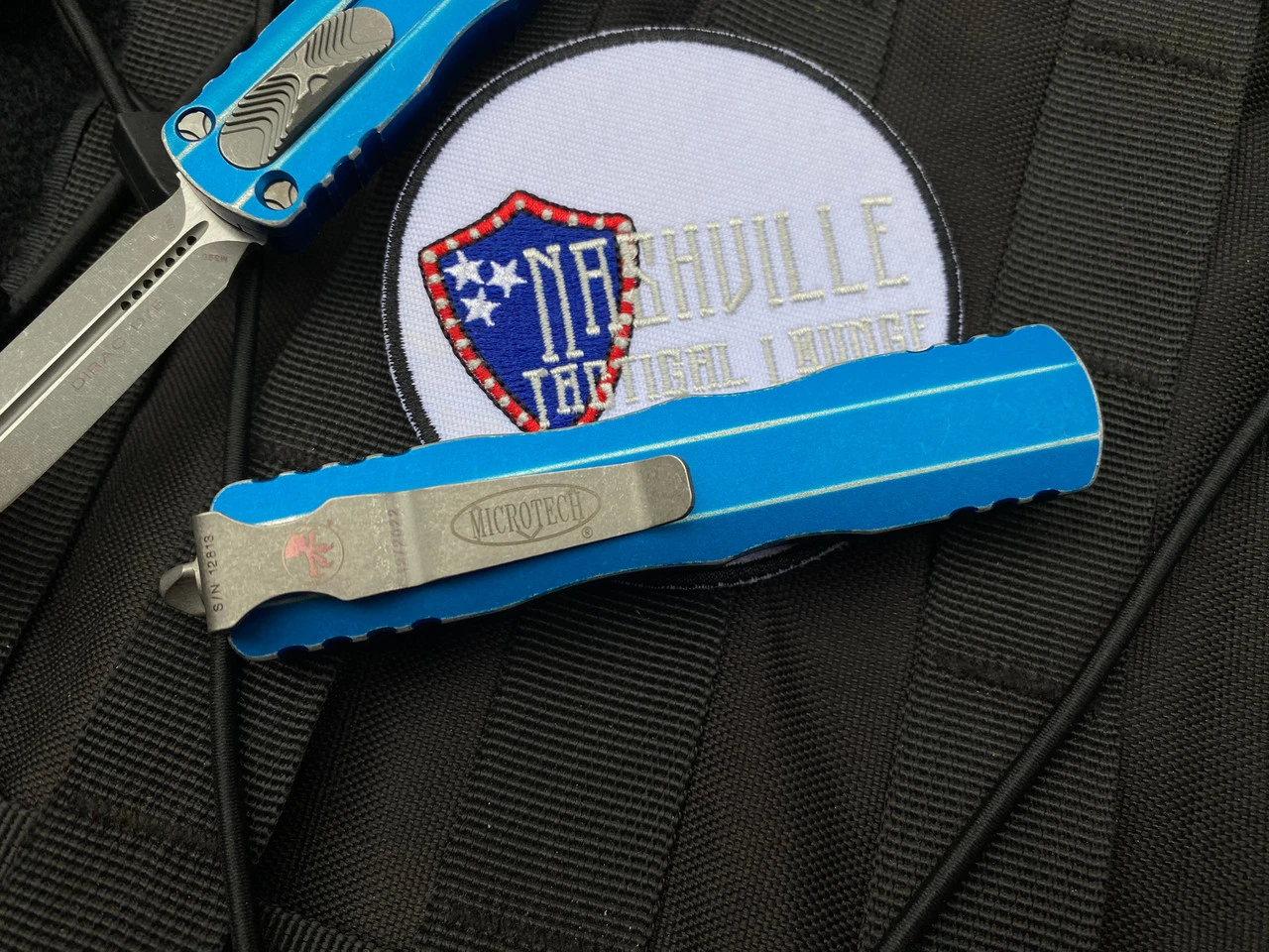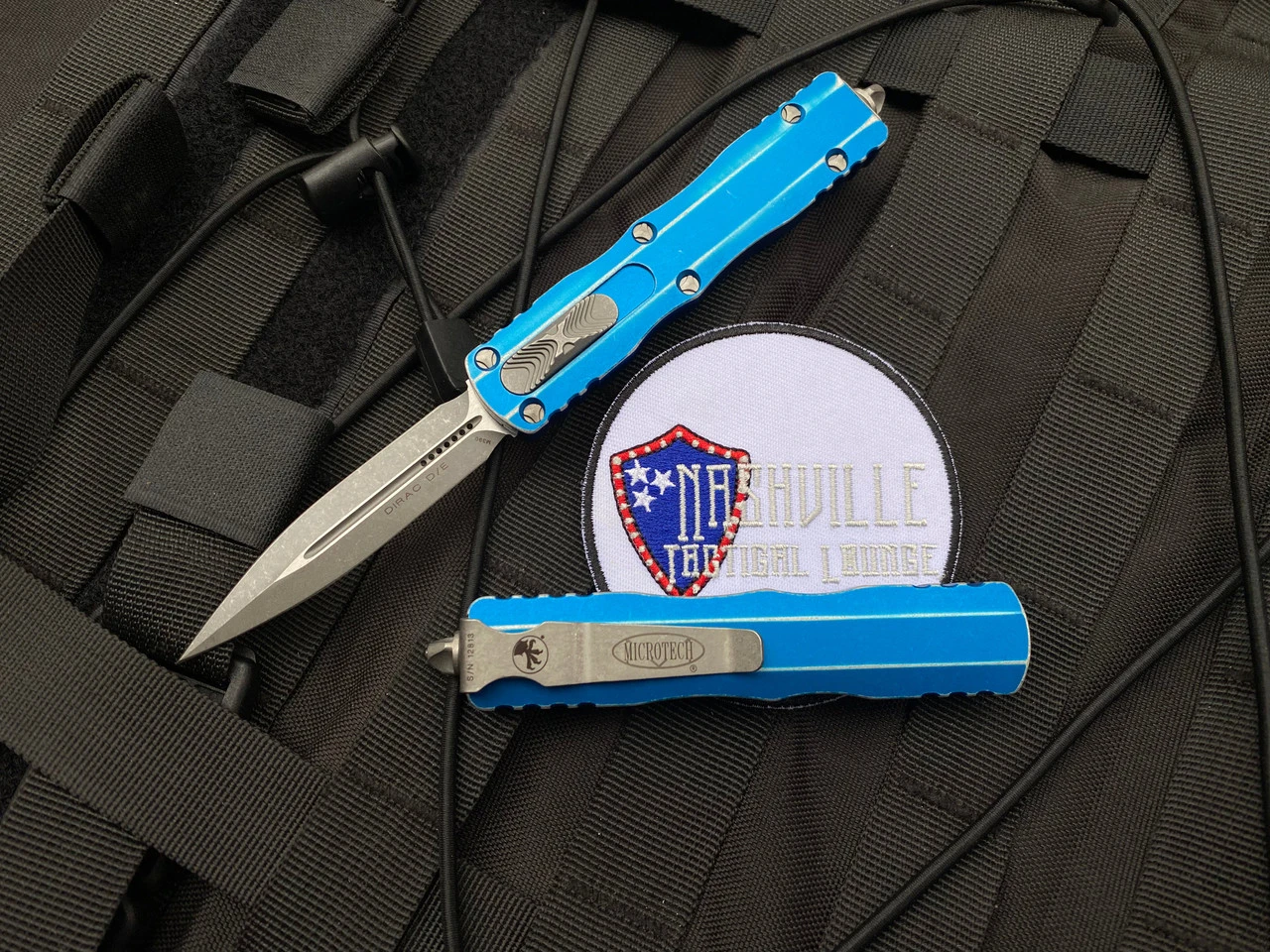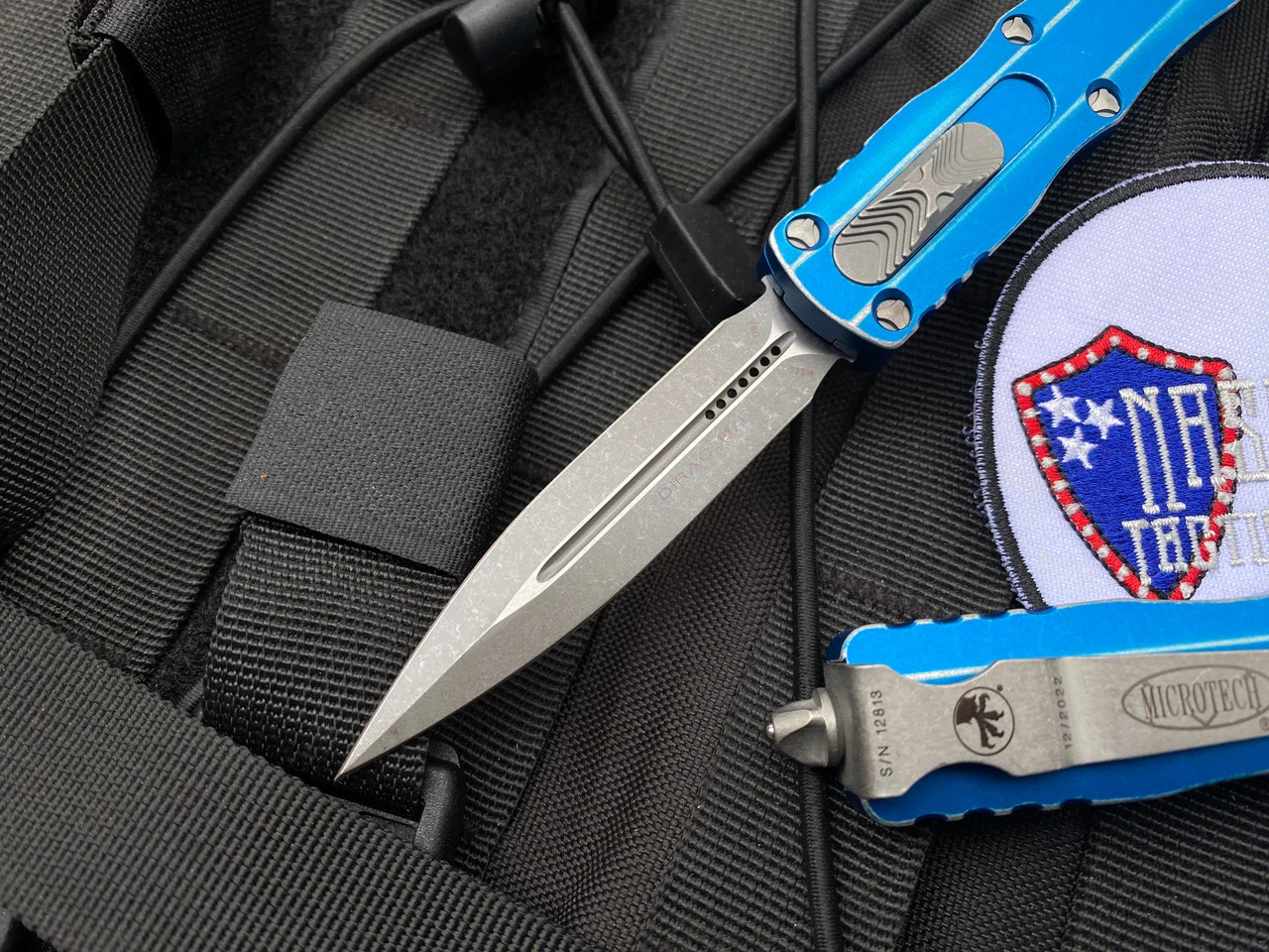Microtech Dirac Distressed Blue Aluminum Body W/ Atonewashed Plain Edge Blade (2.92”) 225-10DBL