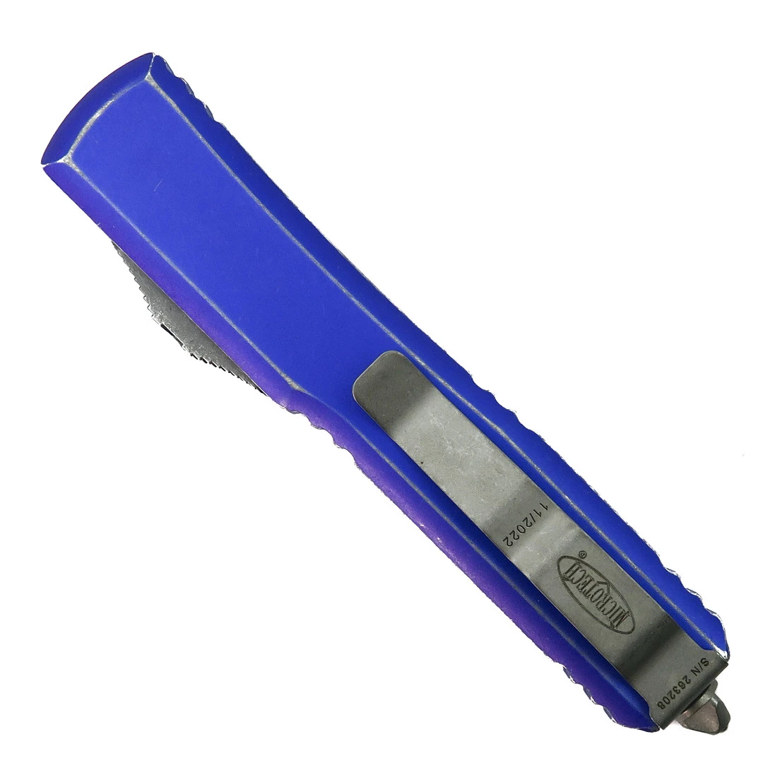 This Microtech Ultratech out-the-front automatic knife features a distressed purple anodized aluminum handle and an apocalyptic finished dagger blade.