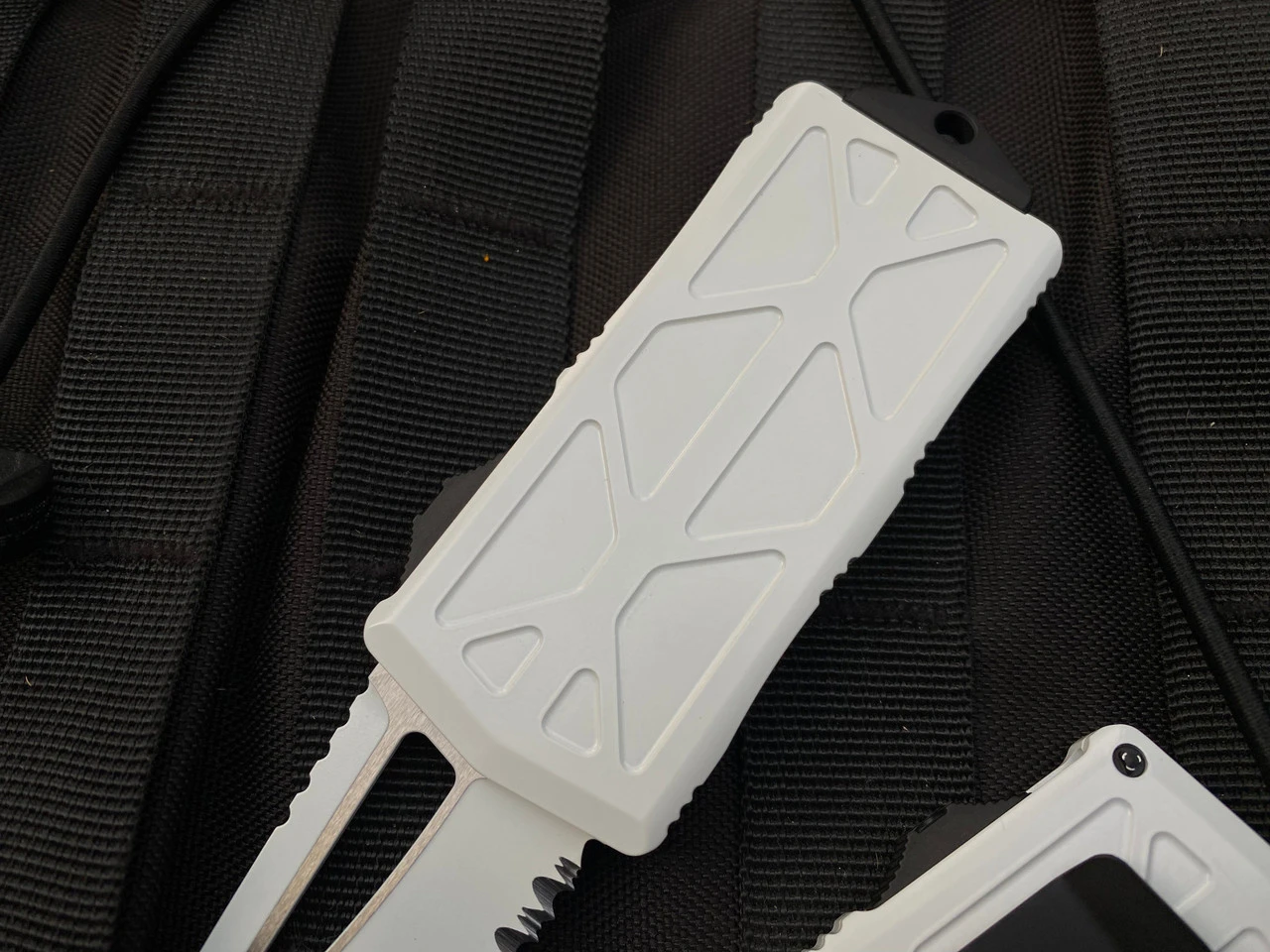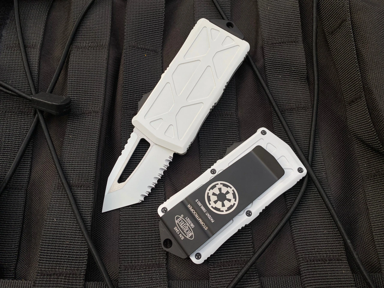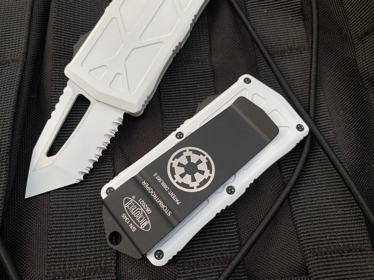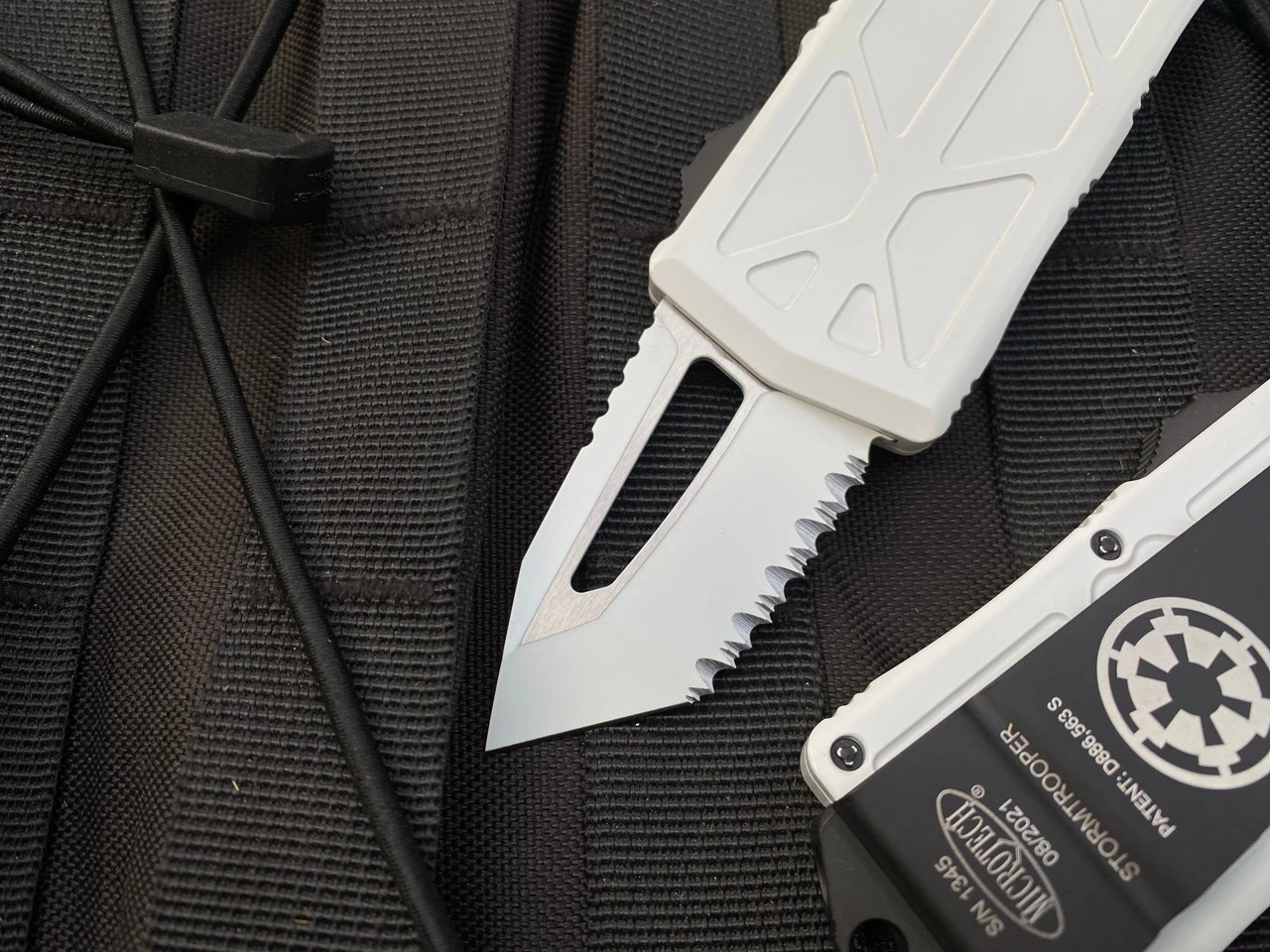 Microtech Exocet Stormtrooper T/E White Aluminum Body W/ White Full Serrated Blade (1.9”) 158-3ST