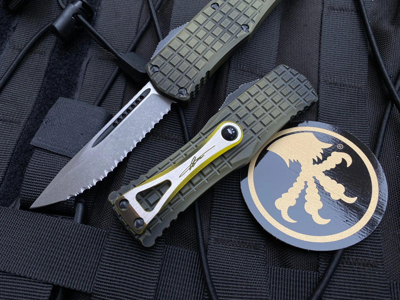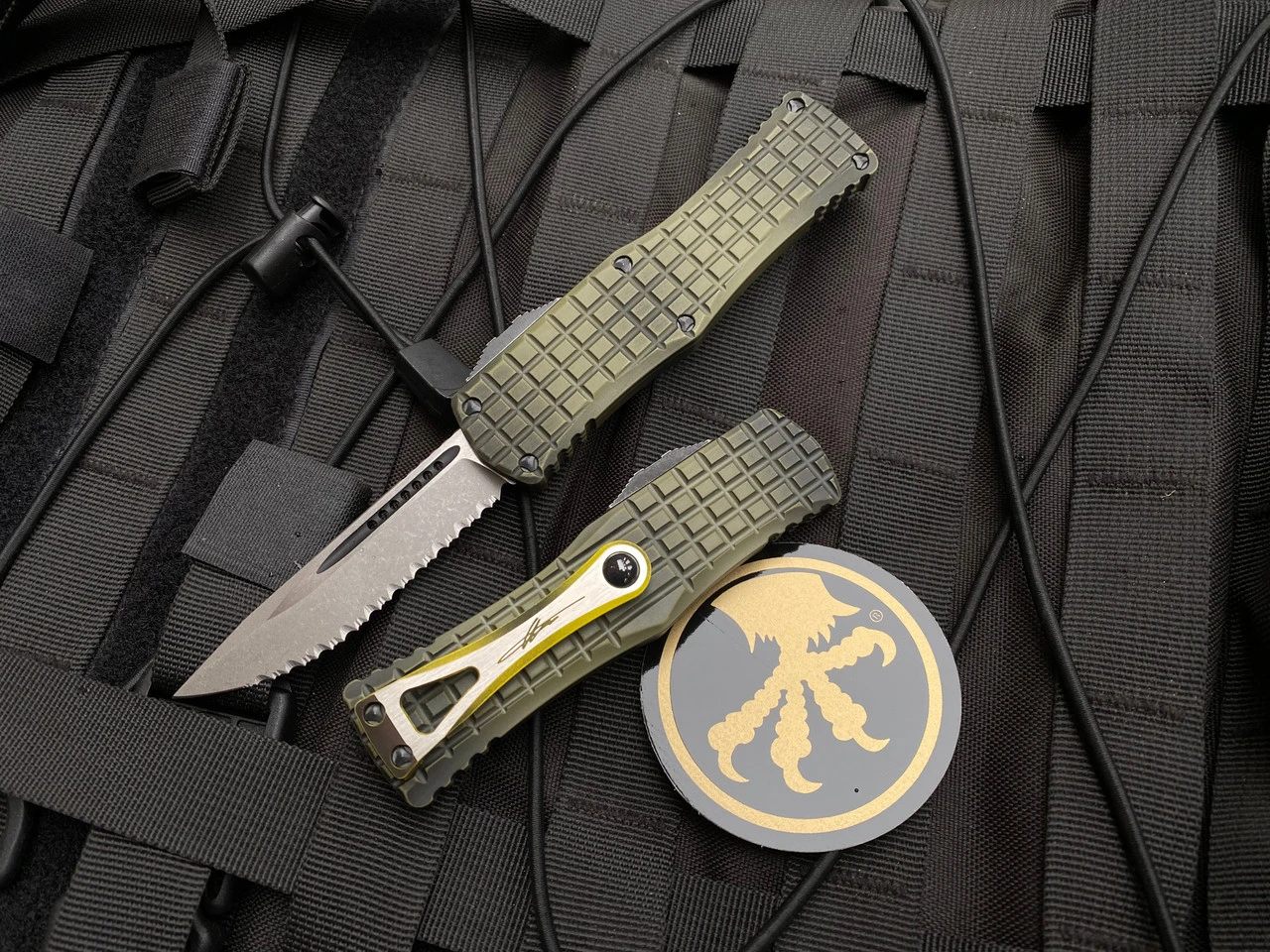 Microtech Hera S/E Frag Off Green Frag Pattern Aluminum Body W/ Yellow Accents And Apocalyptic Full Serrated Blade (3.08”) 703-12APFRGS