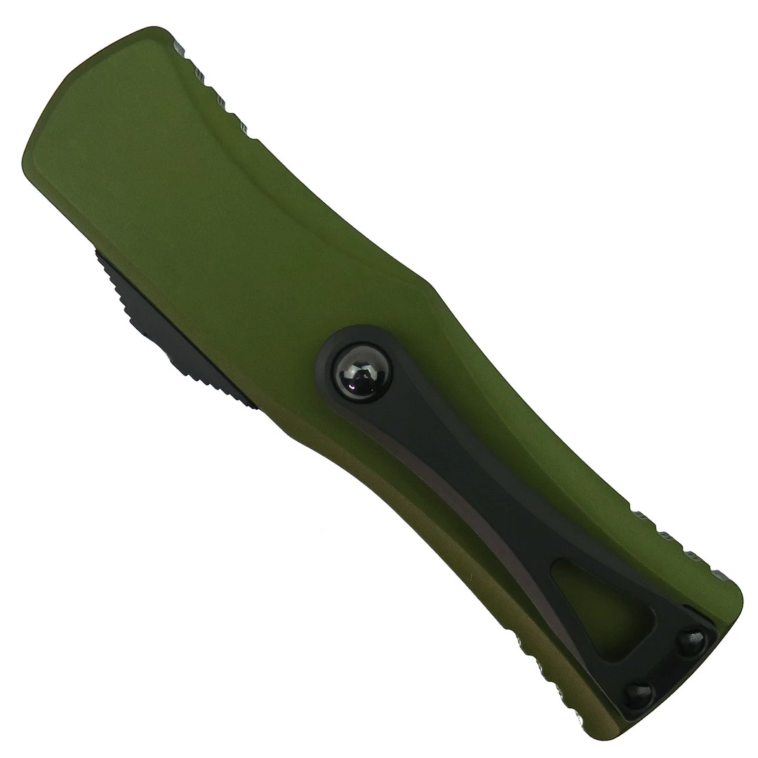 The Microtech OD Green Hera OTF is a tactical knife with a beautiful, ergonomic design. This knife features a dagger blade which is fully serrated on one side and plain on the other, providing you with a variety of cutting abilities. The blade is paired up with an OD Green anodized aluminum handle.