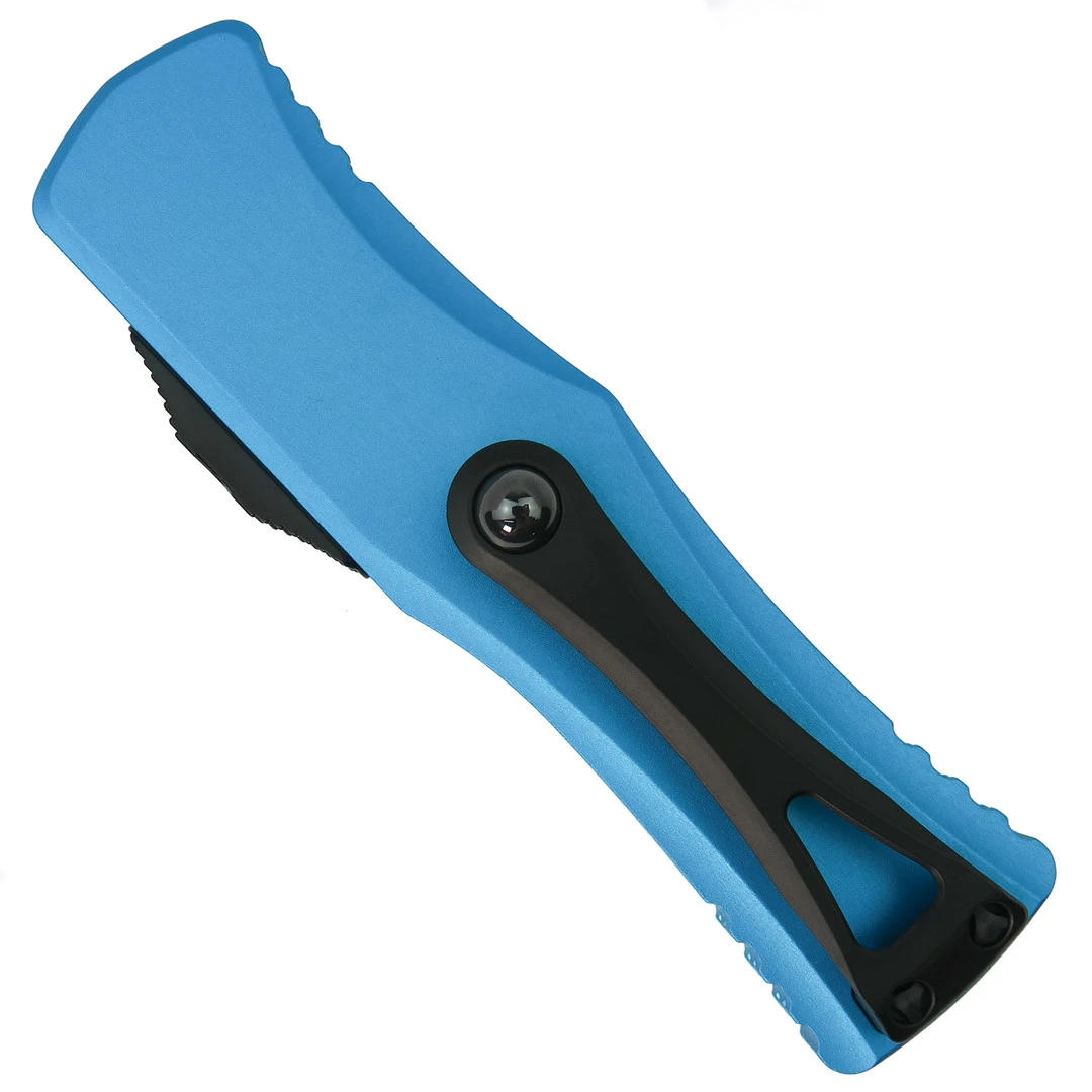 This Microtech Knives Hera OTF automatic knife features an M390 dagger blade with a black finish. The sleek blade is paired up with a turquoise anodized aircraft aluminum handle.