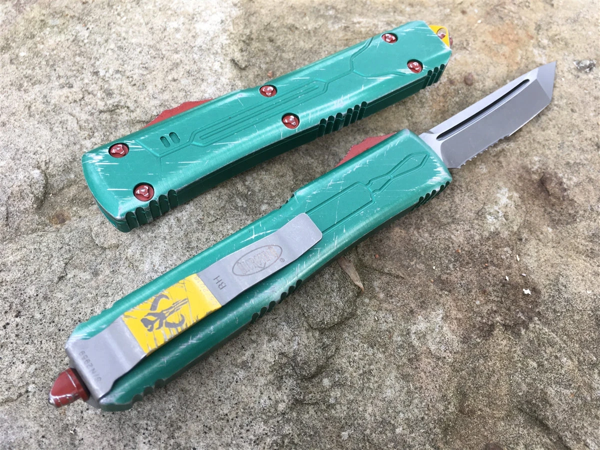 From a galaxy far, far away the Microtech Bounty Hunter Ultratech raises the bar for Out-The-Front knife technology. This Microtech Ultratech Standard performs as good as it looks with its razor sharp, partially serrated tanto edge blade and Boba Fett Bounty Hunter Themed chassis, hardware and pocket clip. Microtech’s proprietary design allows the springs to rest in both the open and closed positions, drastically reducing wear and improving performance. The aircraft-grade aluminum chassis is contoured providing a lightweight and ergonomic feel and comes in a smooth, anodized finish.