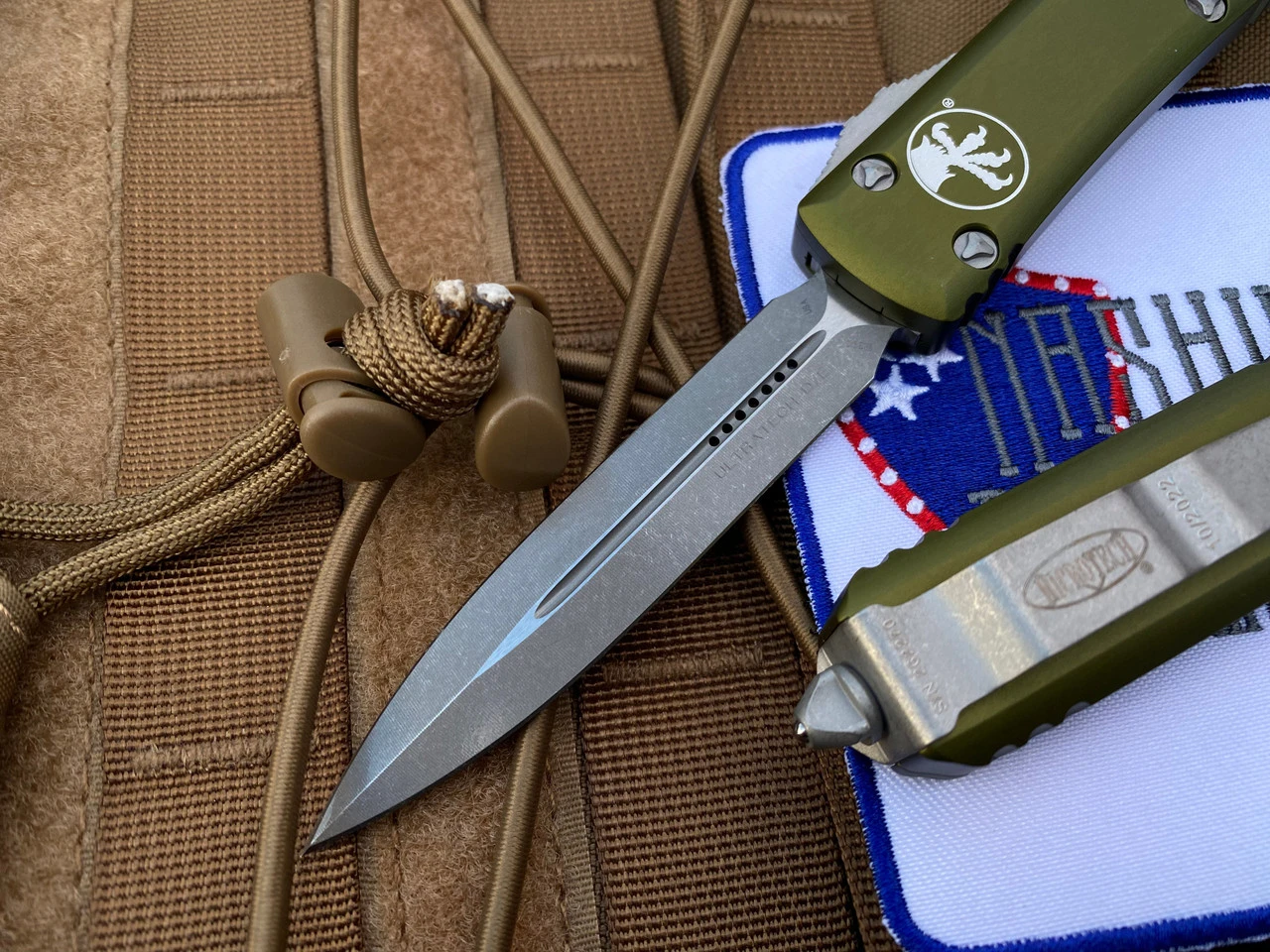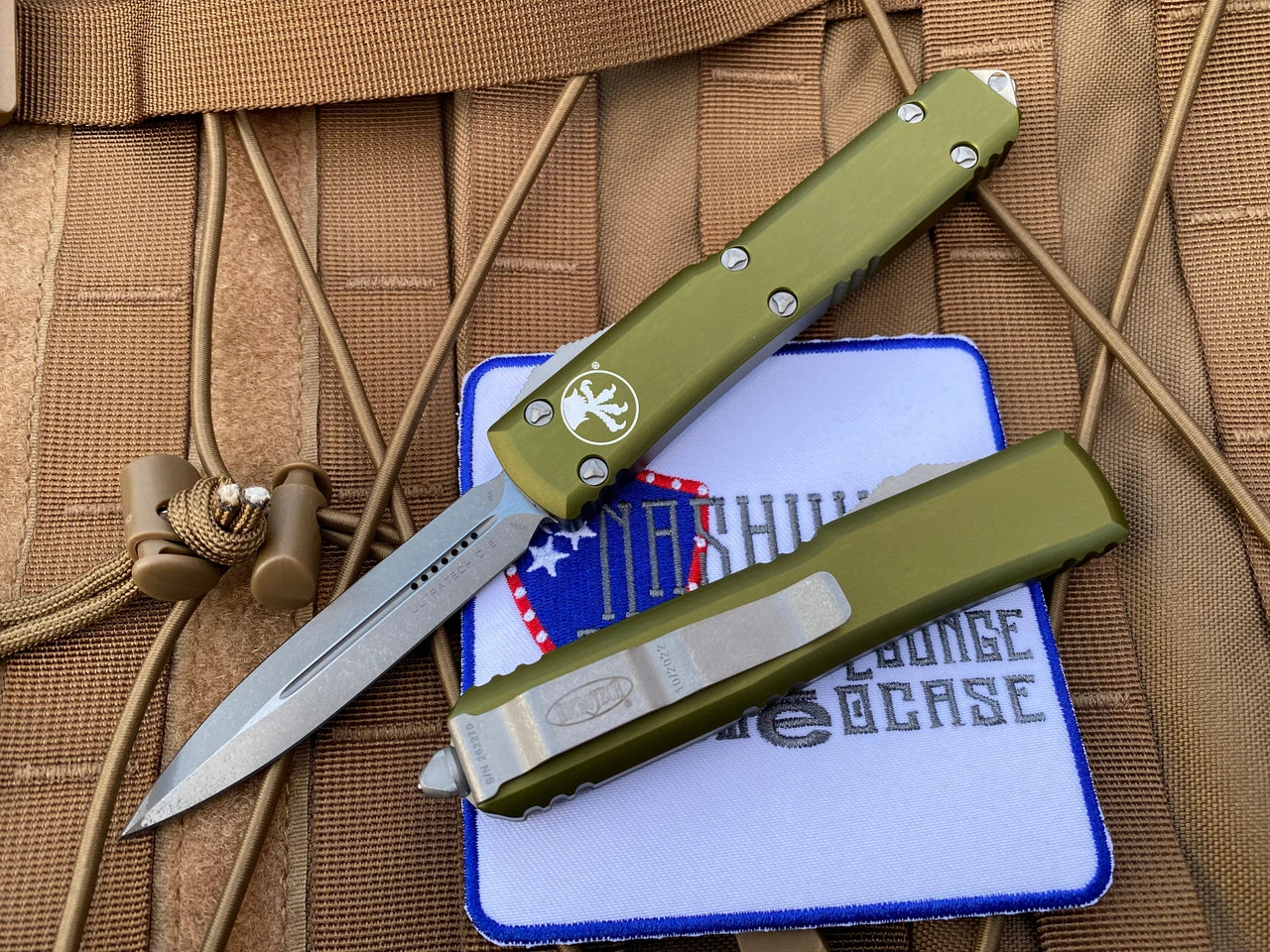 Microtech Ultratech D/E OD Green Aluminum Body W/ Apocalyptic Finished Plain Edge Blade (3.4”) 122-10APOD
