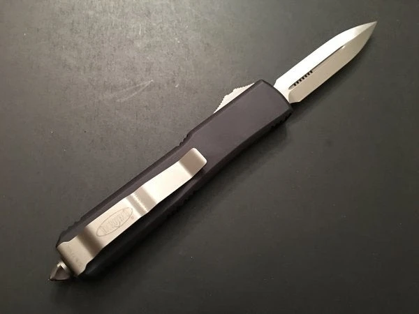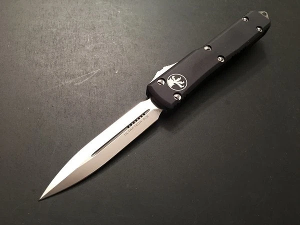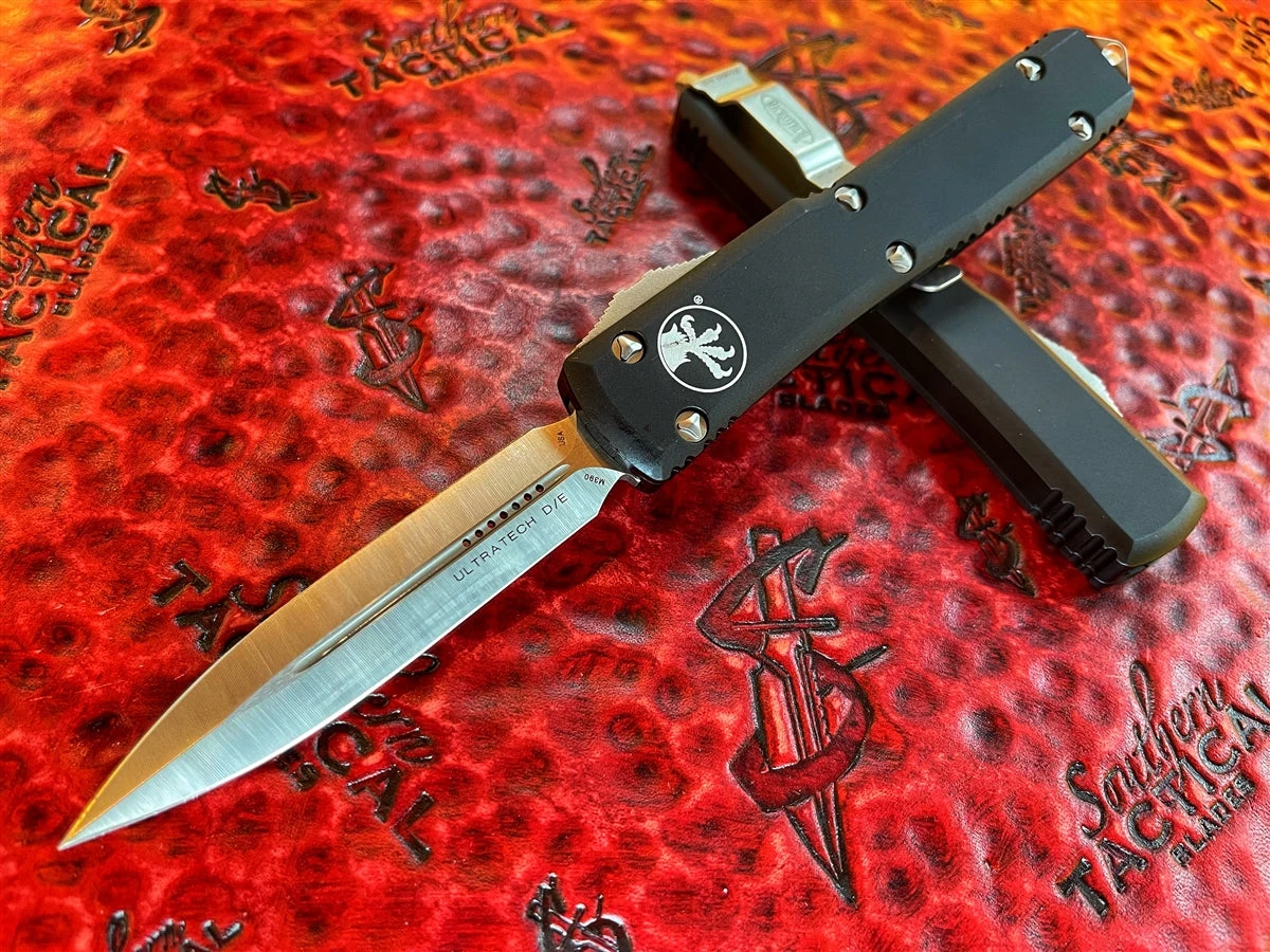 As Microtech’s flagship knife model, the Microtech Ultratech Standard with Satin Double Edge (D/E) blade raises the bar for Out-The-Front knife technology. The proprietary design allows the springs to rest in both the open and closed positions, drastically reducing wear and improving performance. The contoured chassis handle provides a lightweight and ergonomic feel and comes with a smooth matte black base finish.