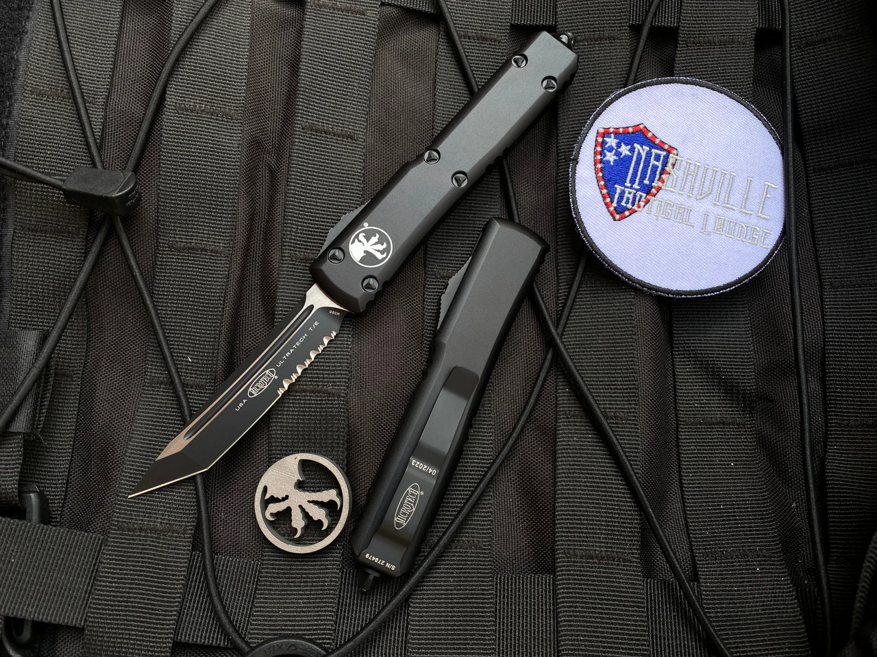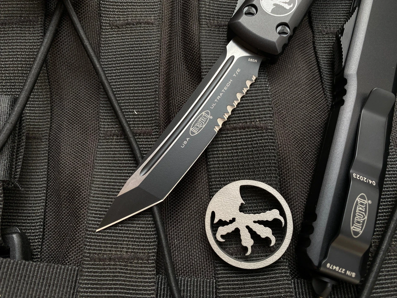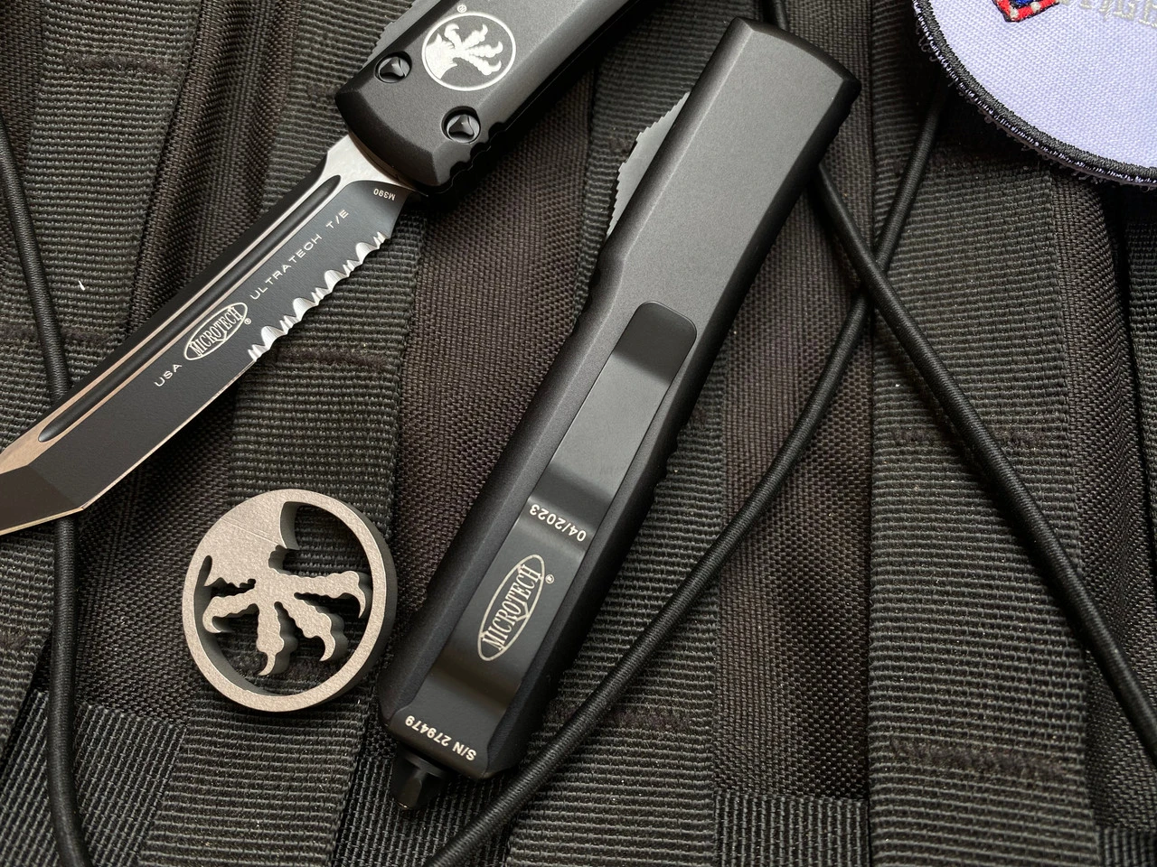 Microtech Ultratech T/E Black Tactical Aluminum Body W/ Two Tone Black Partially Serrated Blade (3.4″) 123-2T