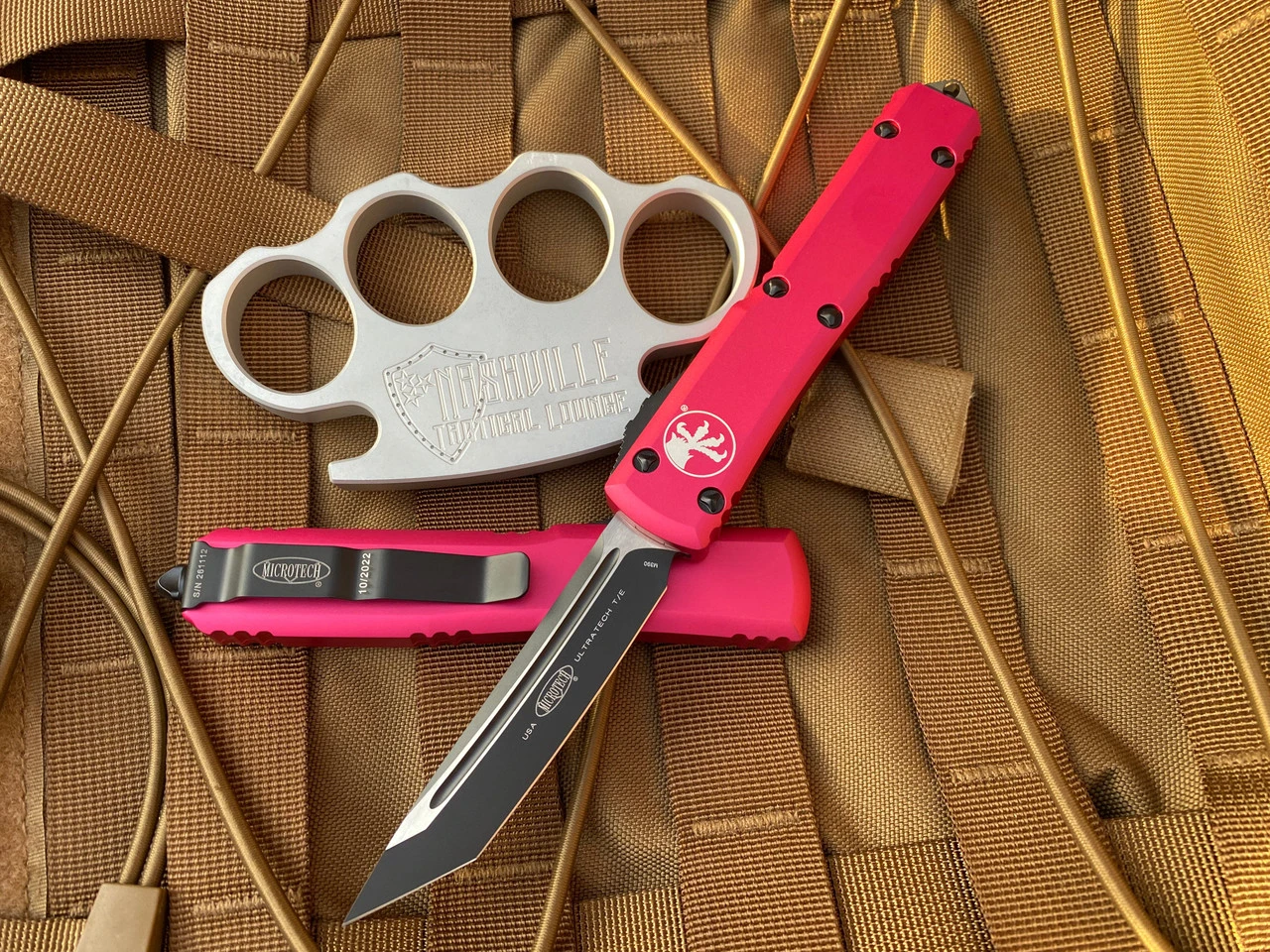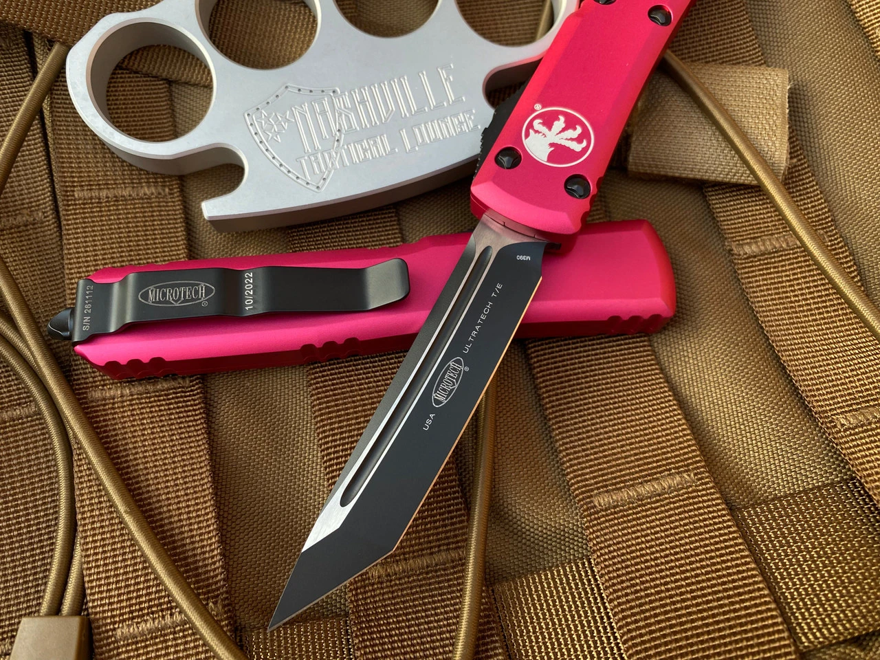 Microtech Ultratech T/E Pink Aluminum Body W/ Black Plain Edge Blade (3.4”) 123-1PK