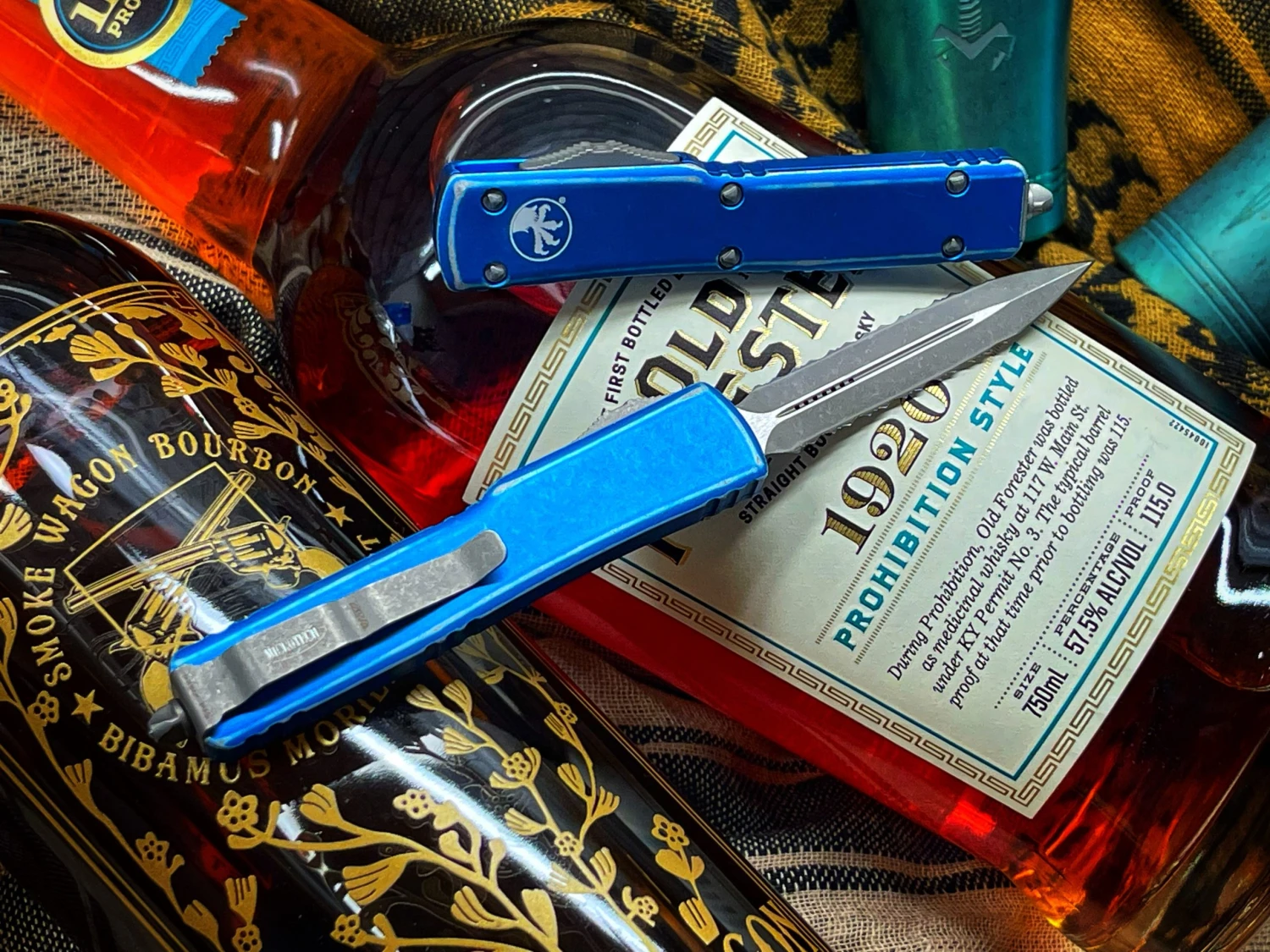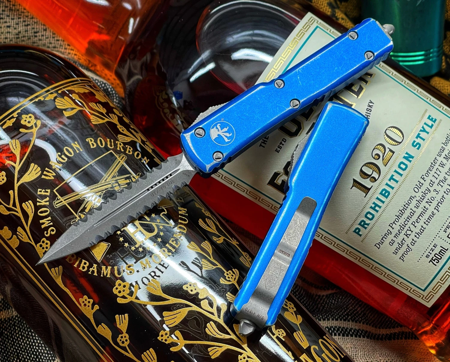 Microtech UTX-70 Double Edge Double Full Serrated Apocalyptic Distressed Blue (147-D12DBL)