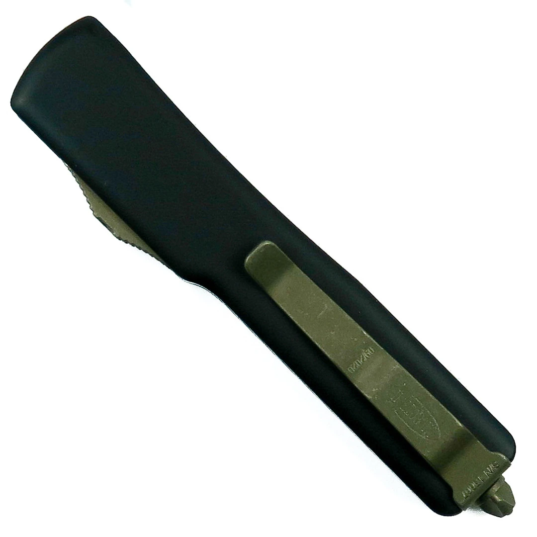 This Microtech UTX-70 OTF Auto knife features a bronzed apocalyptic finished dagger blade along with a black anodized aircraft-grade aluminum handle.