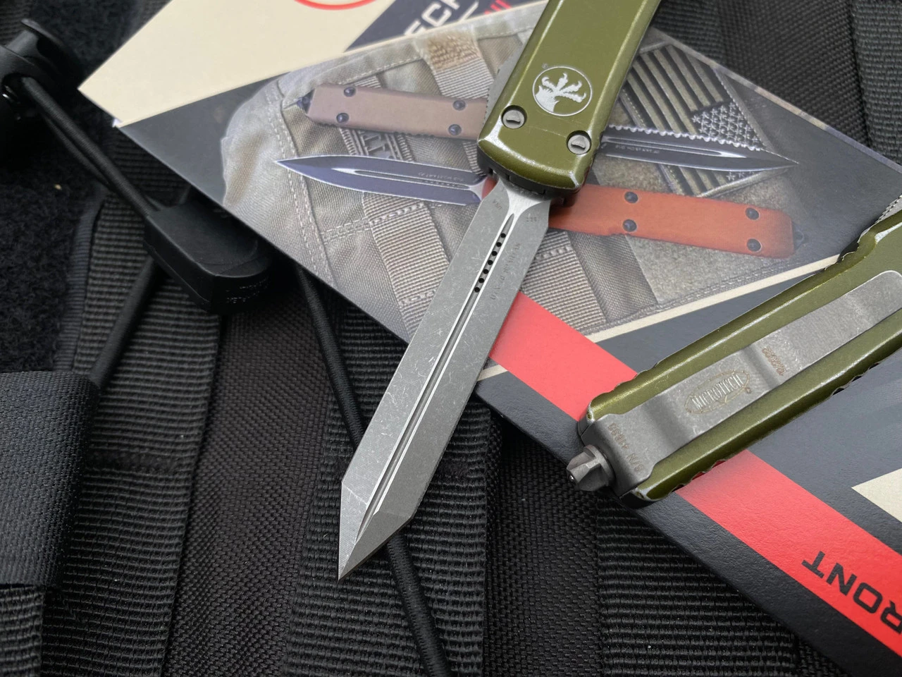 Microtech UTX-70 Spartan OD Green Distressed Aluminum Body W/ Apocalyptic Plain Edge Blade (2.42”) 249-10DOD