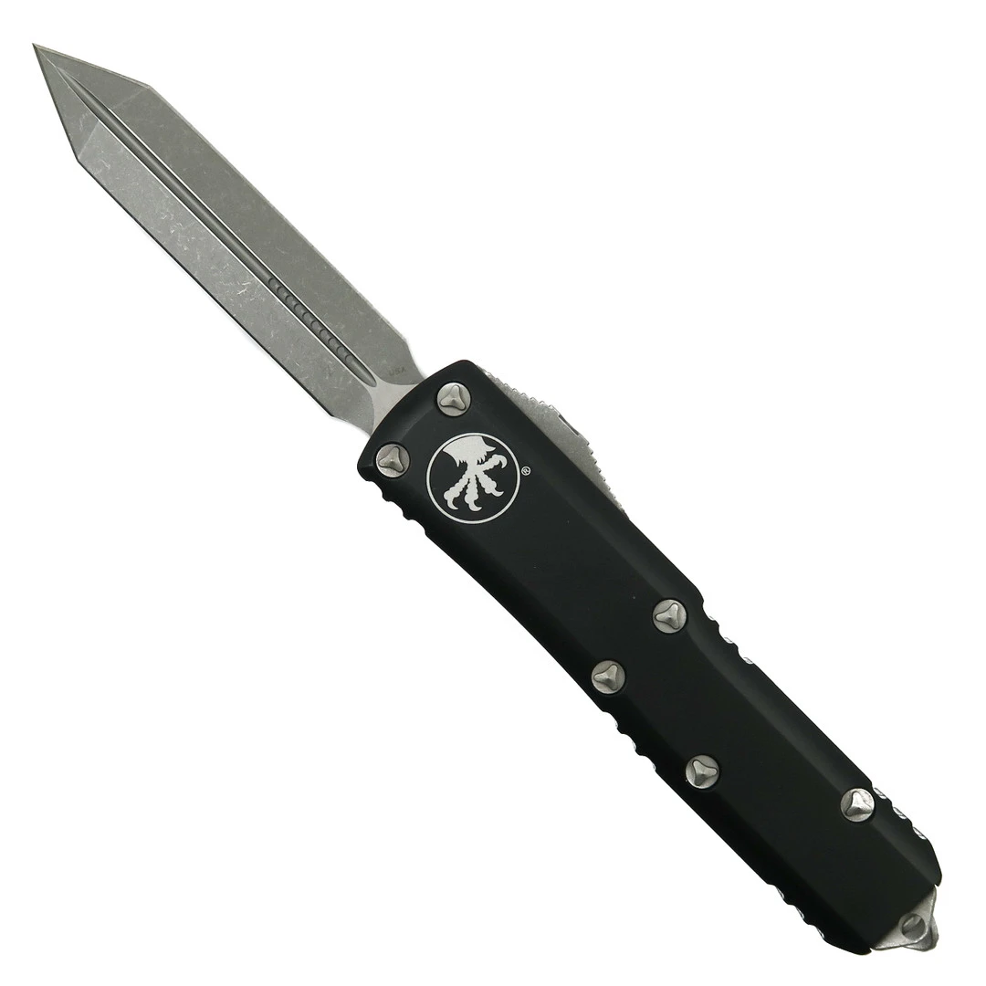 This Microtech Spartan UTX-85 OTF Auto knife boasts a black anodized handle complete along with an Apocalyptic finished double tanto “Spartan” style blade.