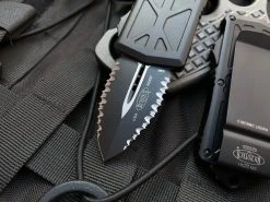 Microtech Exocet D/E Black Aluminum Body W/ Black Tactical Double Full Serrated Blade (1.9”) 157-D3T